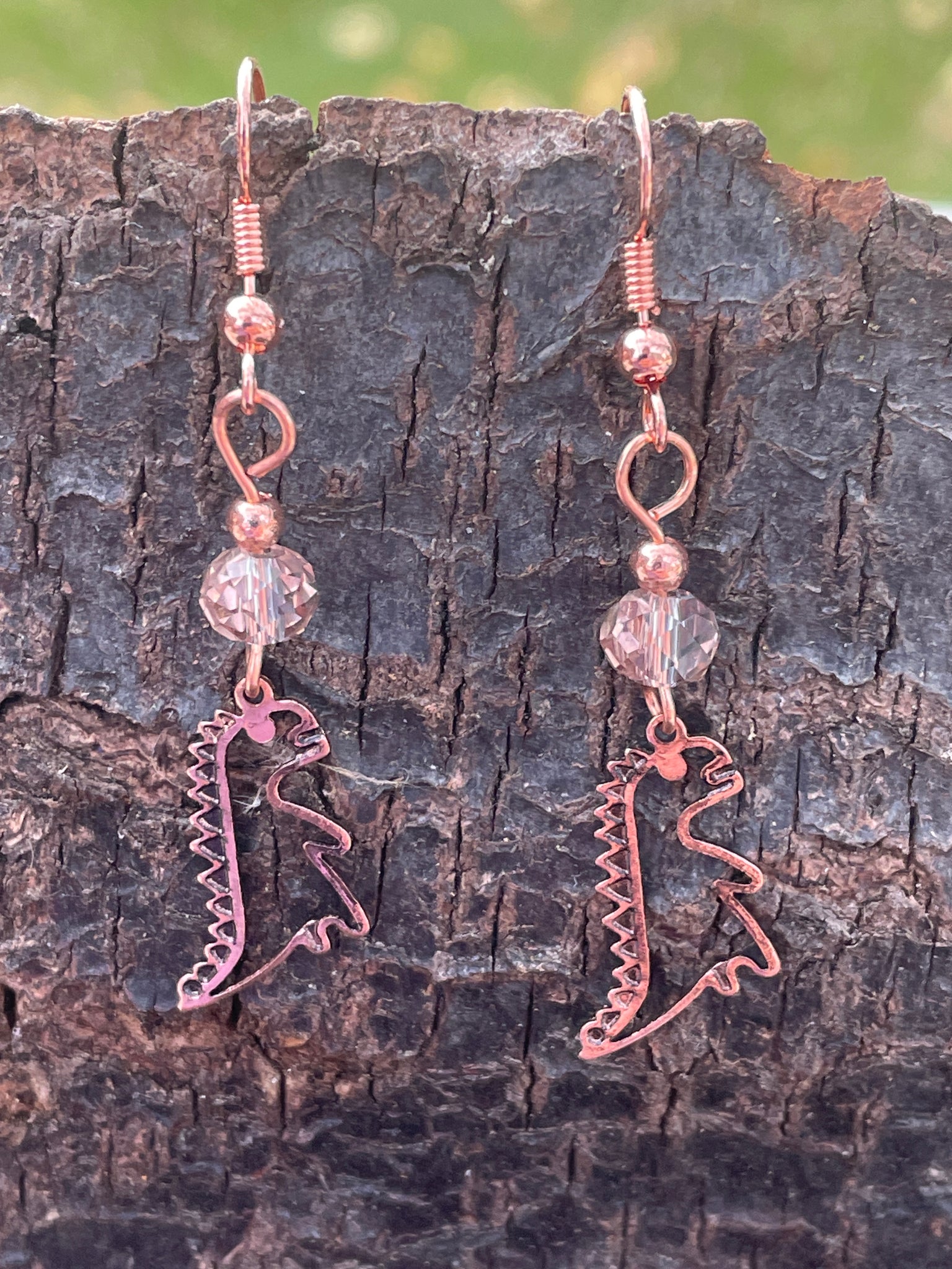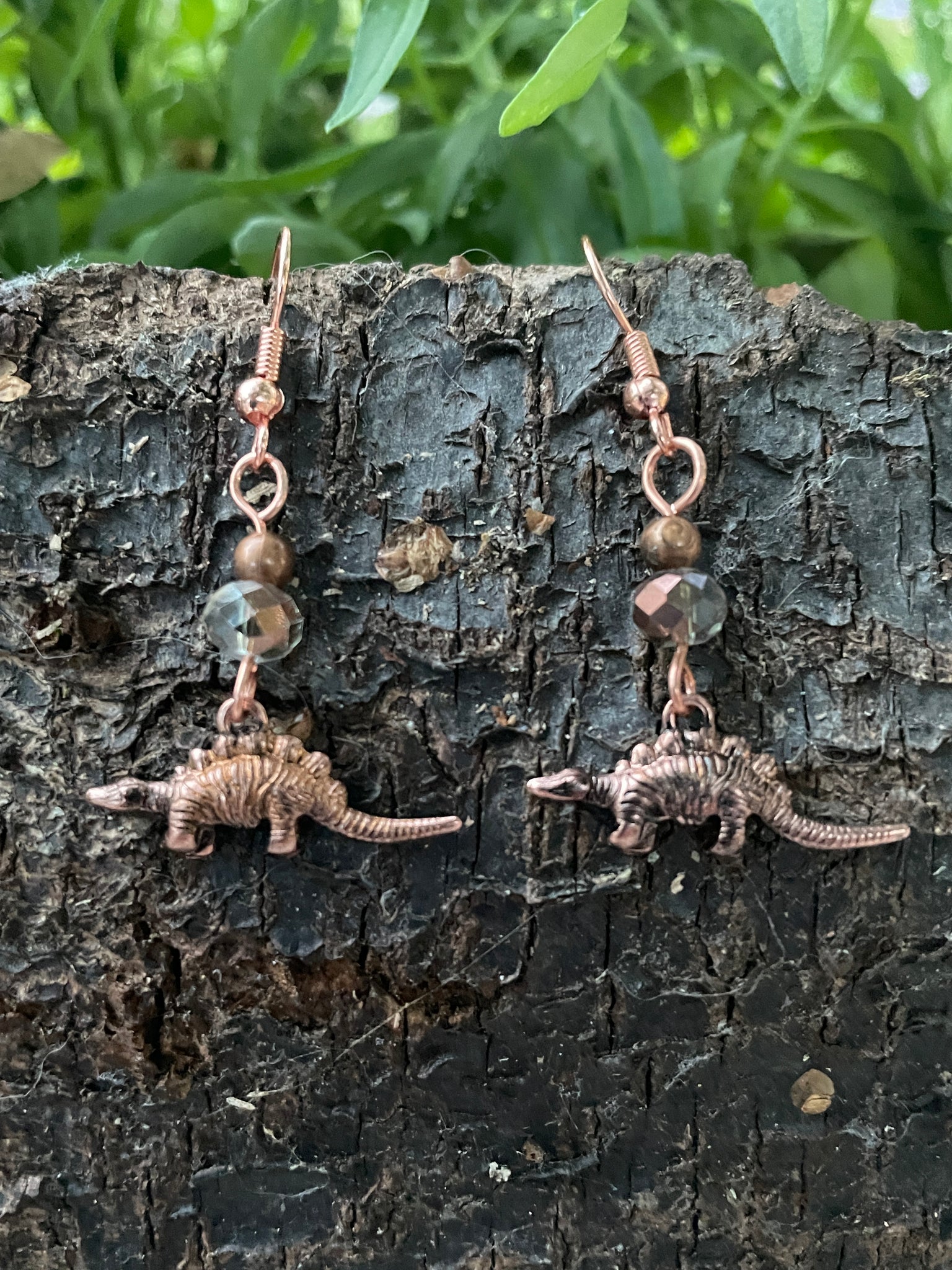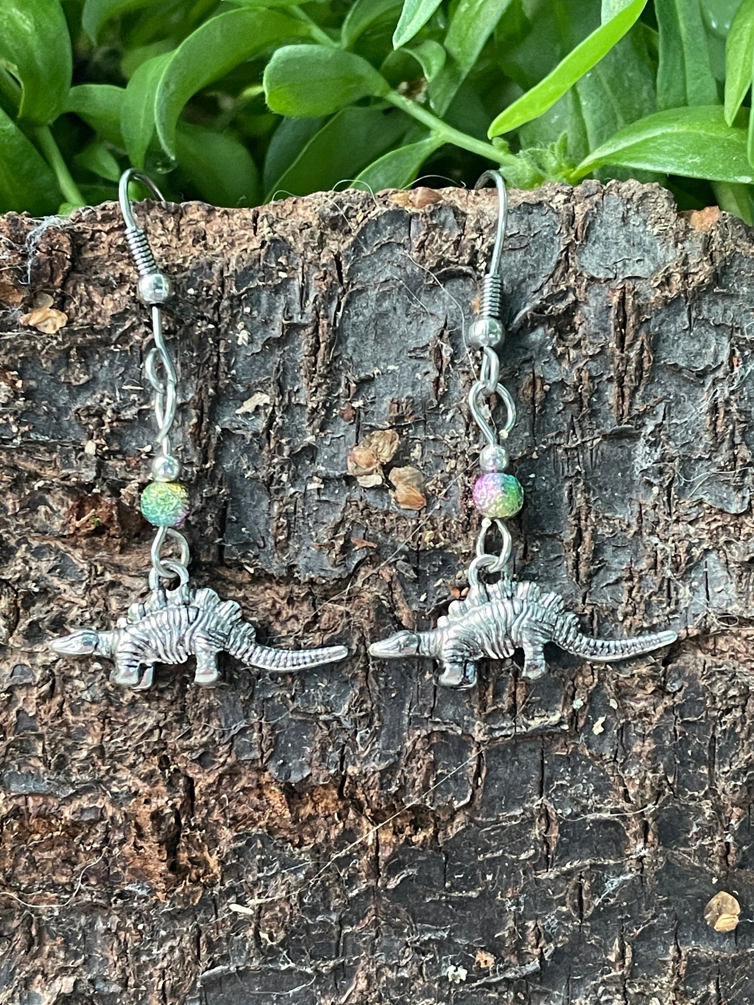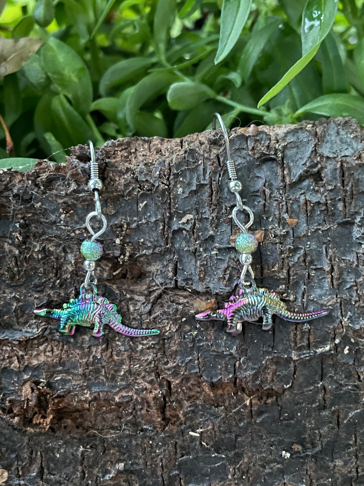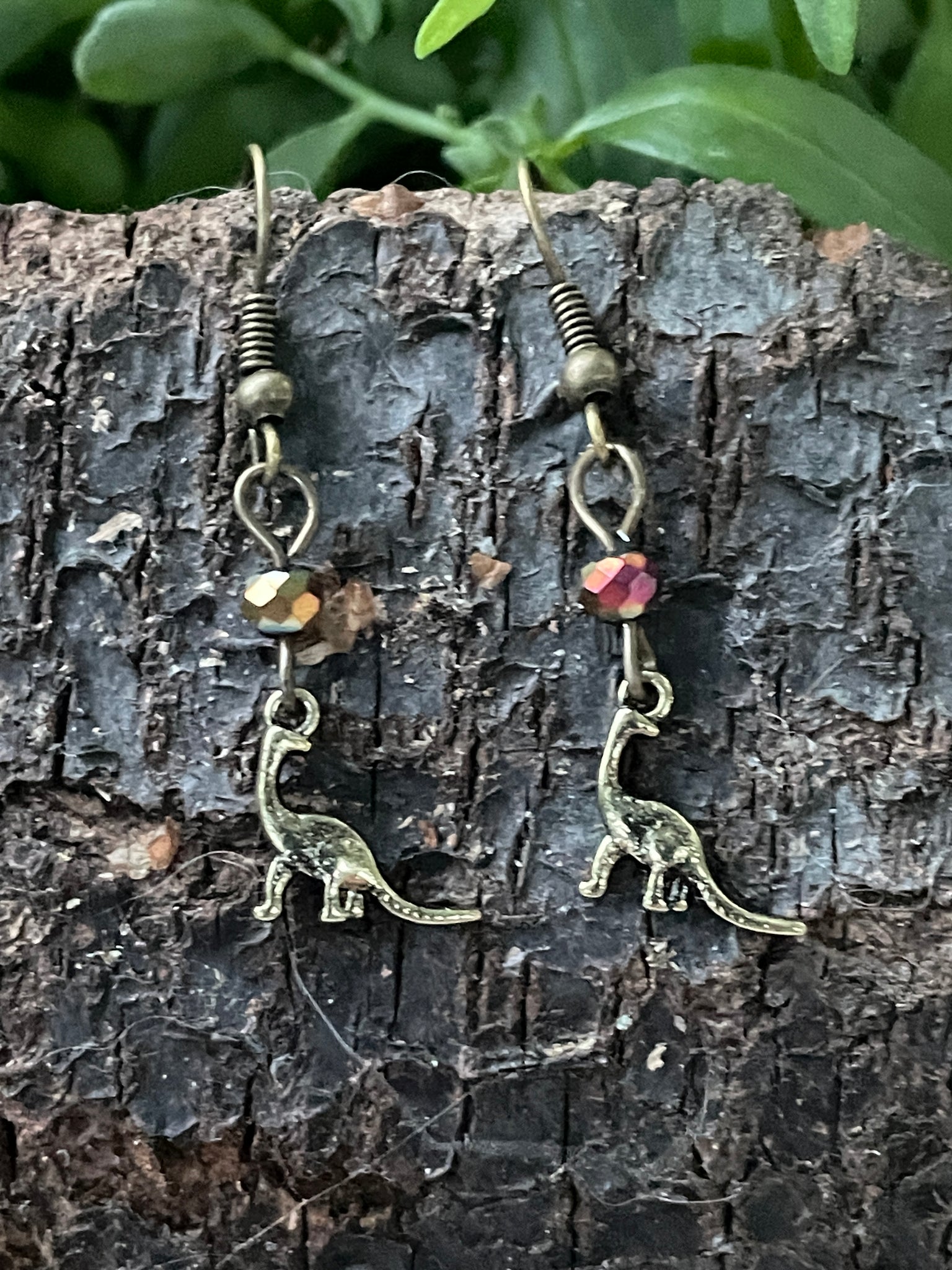 Make a unique style statement with these dino-mite earrings! Perfect for any Jurassic Park fan, these delightful dinosaur earrings will add a fun and unique touch to any outfit. Put these prehistoric ears on and you'll be 'Prehistoric Chic' in no time! The dinosaur earrings are made of metal. costume, crystal, hypo-allergenic or surgical steel ear wires. The small apatosaurus' measure one inch long and 1/2 inch wide. The medium stegosaurus and apatosaurus measure 1 inch long and 3/4 inches wide approximately. The large apatosaurus measures 1 1/4 inches long and 1 1/4 inches wide.