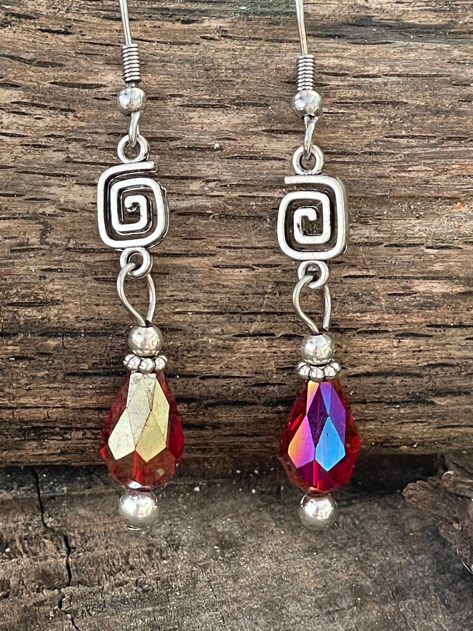 Ruby teardrop earrings are light weight and go from office to evening. The iridescent ruby teardrop earrings are made of costume, crystal and surgical steel ear wires. The ruby teardrop earrings measure 1 1/2 inches long and 3/8 inches wide.
