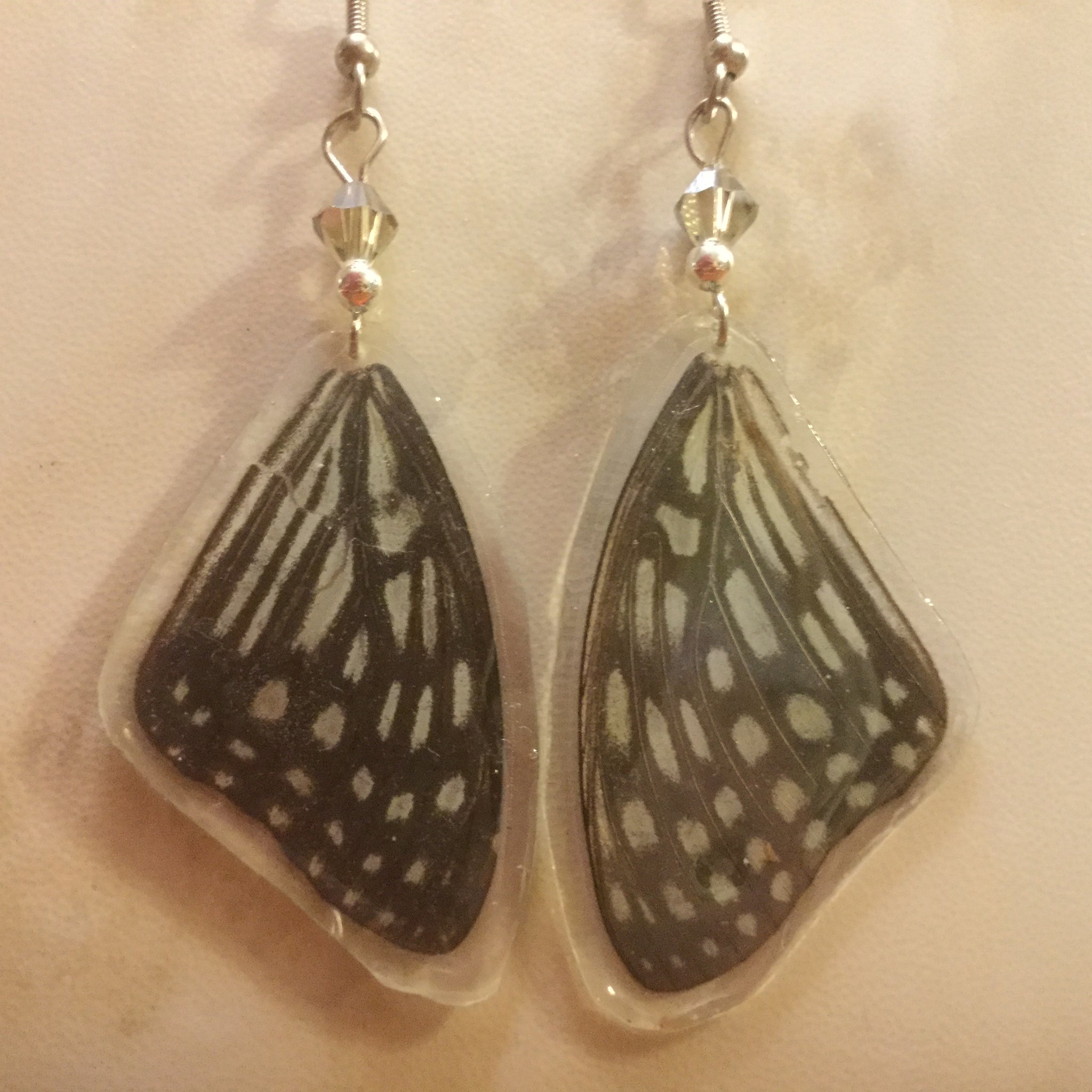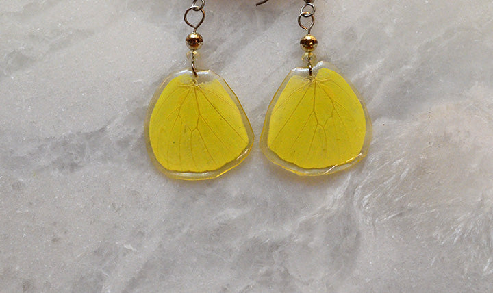 These butterfly earrings are ready to add beauty to your wardrobe with their stunning colors! Your conscience can rest easy knowing that these wings were harvested from butterfly sanctuaries, meaning no butterflies were harmed to make jewelry.  Some of the wings do have small imperfections, marking the life of the butterfly.
