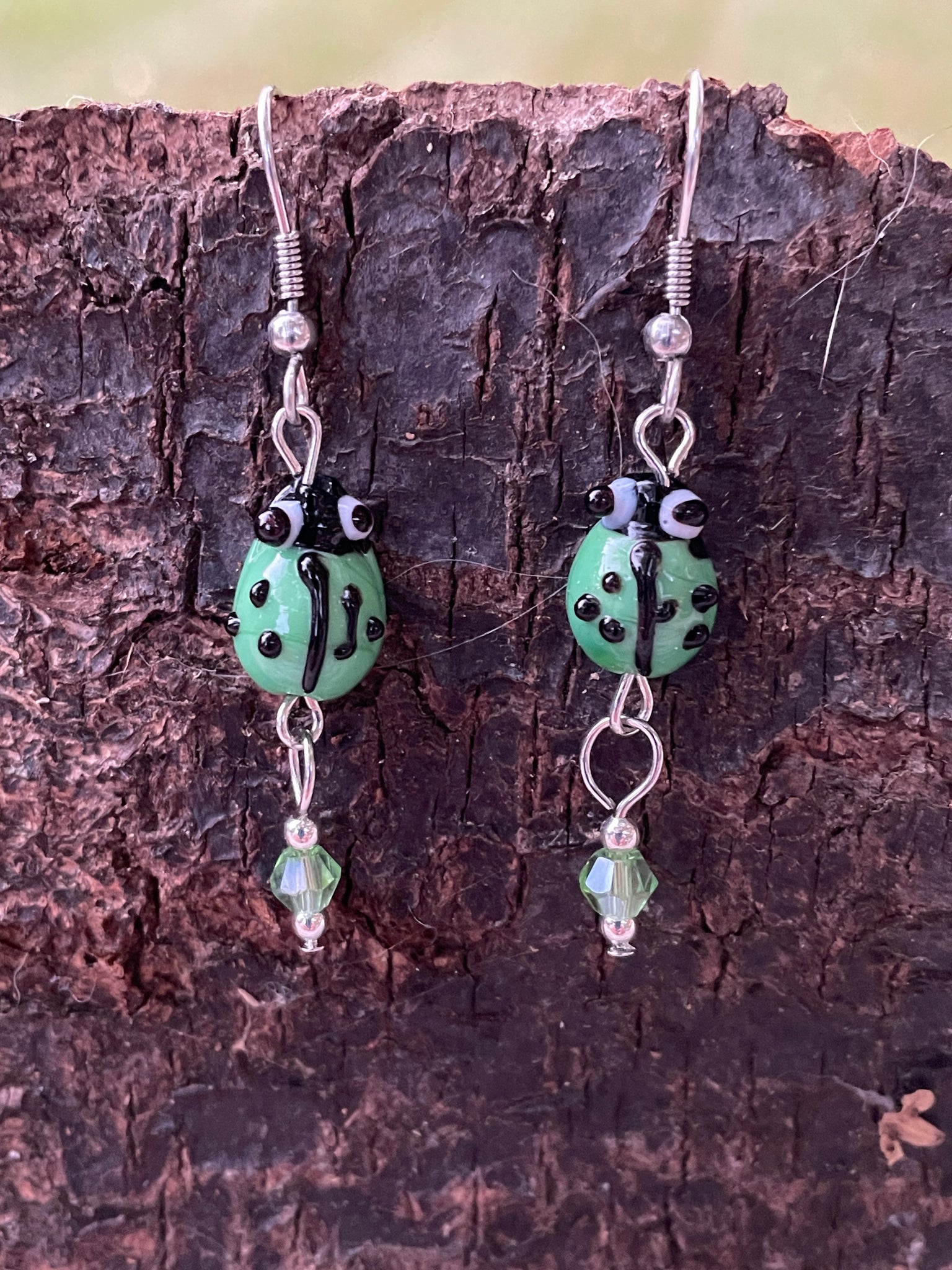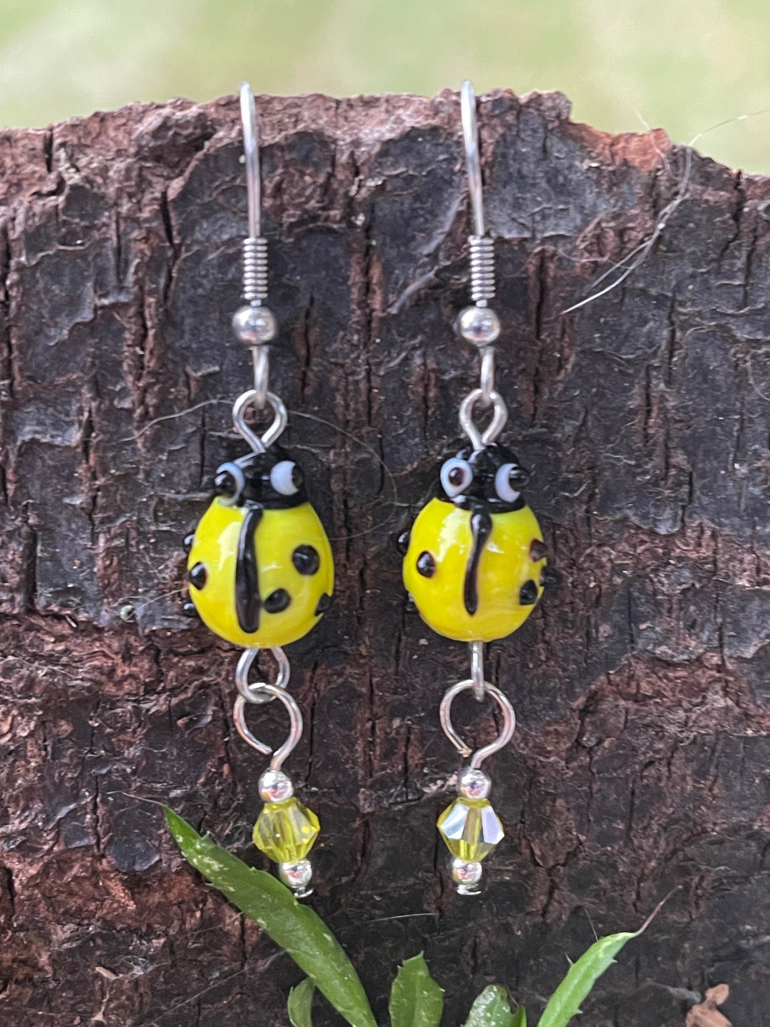 Show off your wild side with these playful glass lady bug earrings! Their cheerful colors will brighten up any outfit, with an added bonus of good luck! Slip them on and get ready to be admired. (Just don't let them fly away!) Lady bug earrings come in a variety of colored glass, crystal, costume and surgical steel ear wires. The lady bug earrings measure 1 1/4 inches long and 5/8 inches wide.