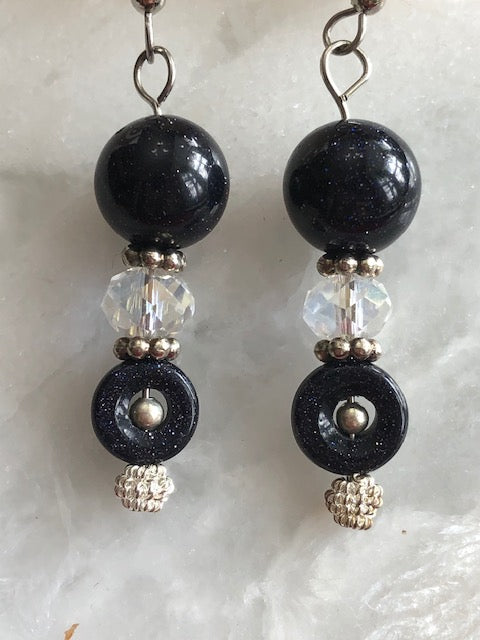 The Blue Goldstone earrings are adorned with aurora borealis crystal, costume spacers and beads. The Blue Goldstone earrings twinkle with silver sparkles like little stars. The earrings measure 1 1/2 inches long and 1/2 inch wide at the widest. The blue goldstone earrings are completed with surgical steel wires.