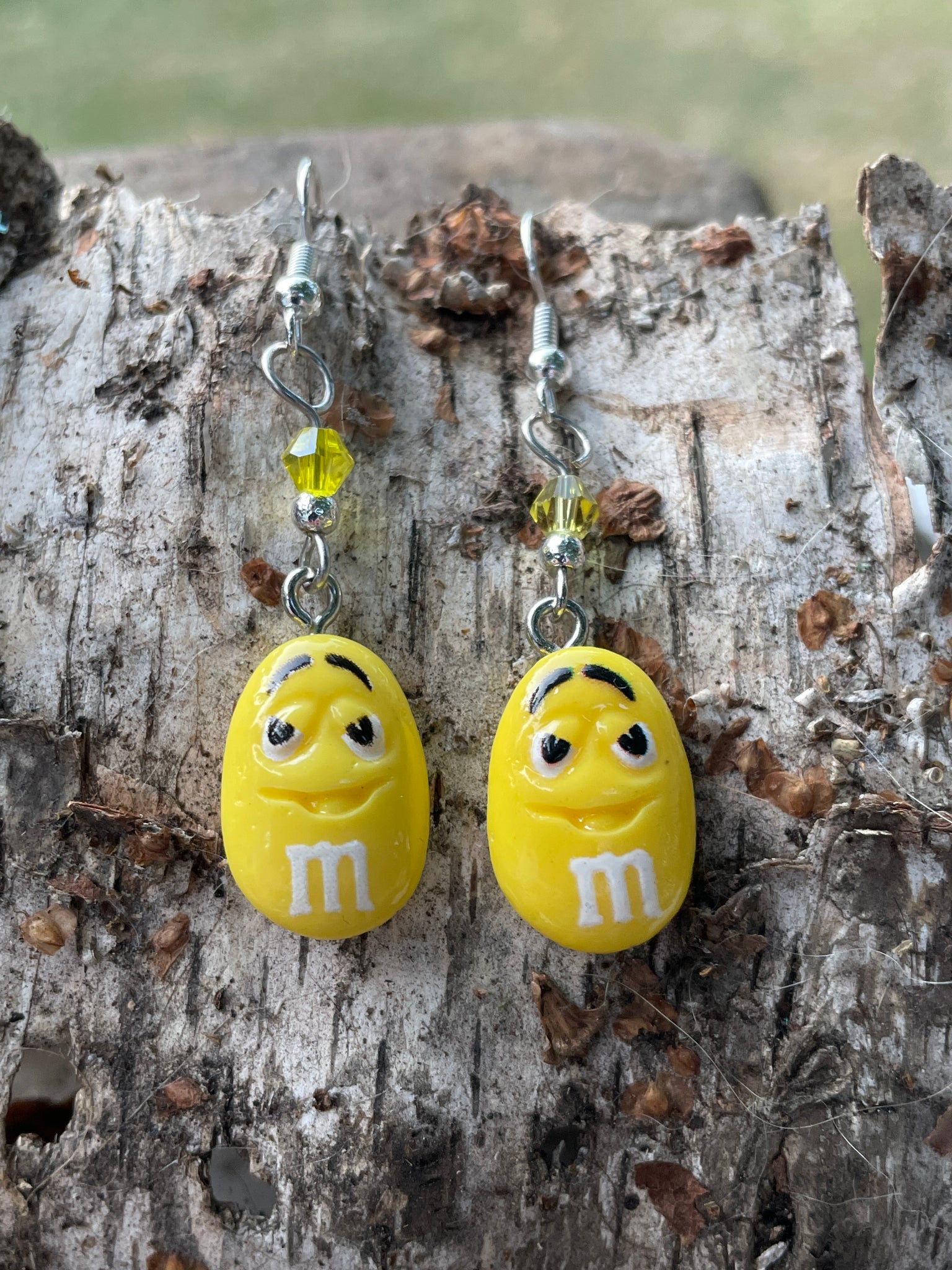Add some colorful and playful charm to any outfit with our M&M earrings! These unique pieces are both quirky and stylish, making them the perfect addition to your jewelry collection. Embrace your fun side with these fun and eye-catching earrings. The M&M earrings measure 1 1/4 inch at the largest, and 1/2 inch wide. The earrings are made of plastic, crystal, costume and surgical stainless-steel wires.