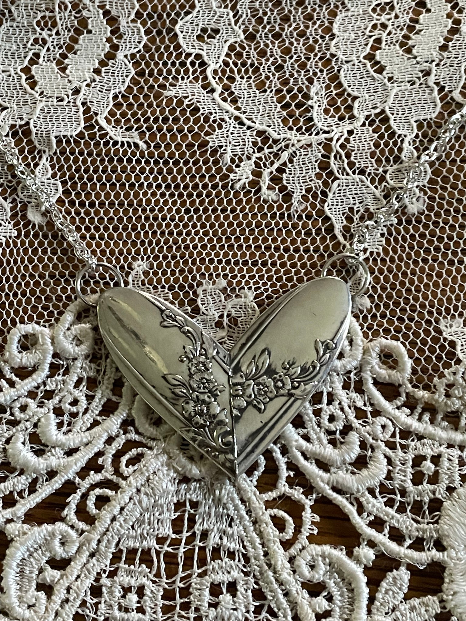 Silver plated Queen Bess II pattern silverware by Community has been crafted into a heart. An 22 inch costume chain finishes the look. Perfect for the one who loves flowers and nature or the one who shares your heart! Other chain lengths can be found under variances.