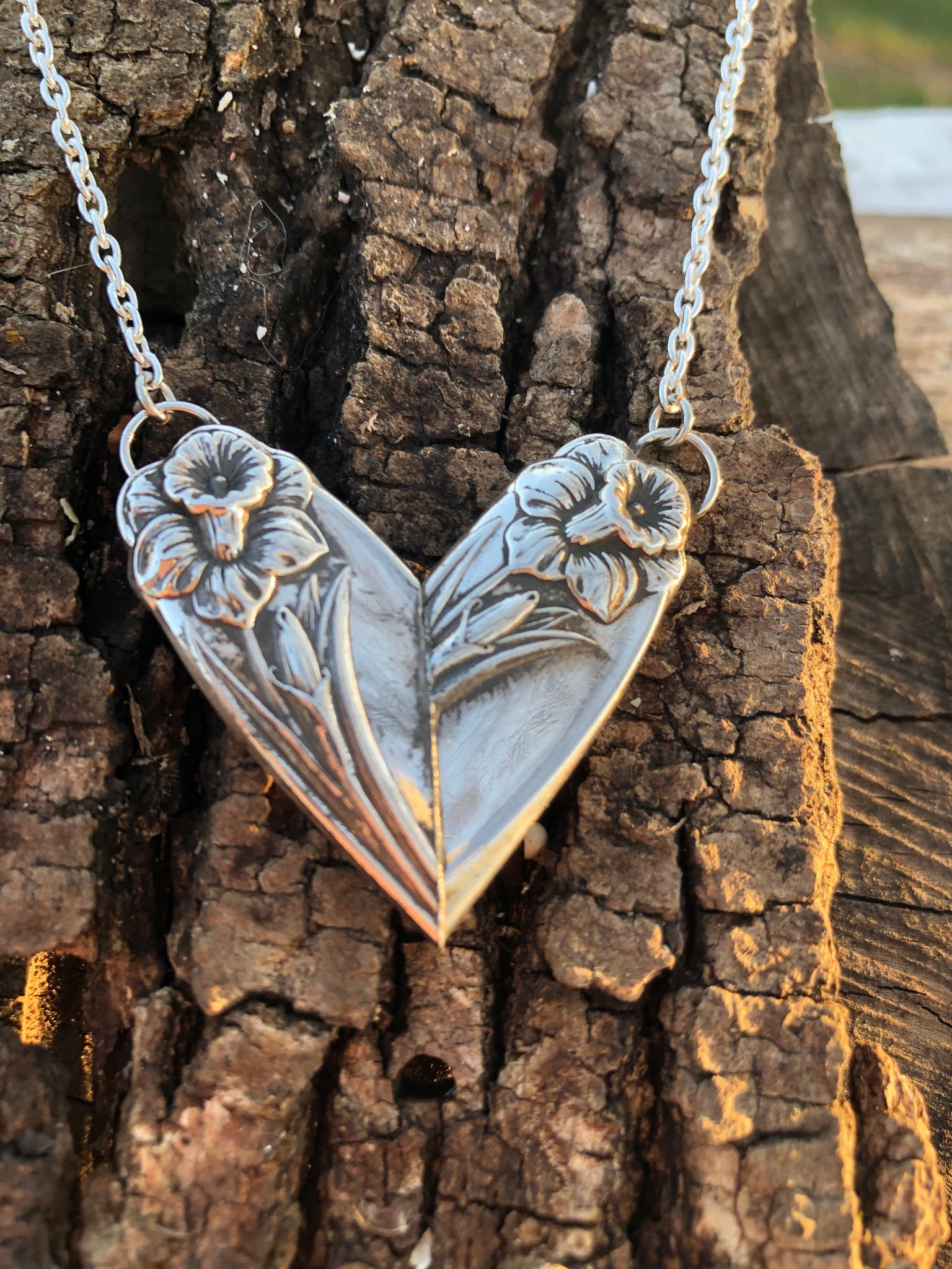 Silver plated Daffodil pattern silverware has been upcycled into a gorgeous heart. An 18- inch costume chain finishes the look of a daffodil heart necklace. Perfect for the one who loves flowers and shares your heart!
