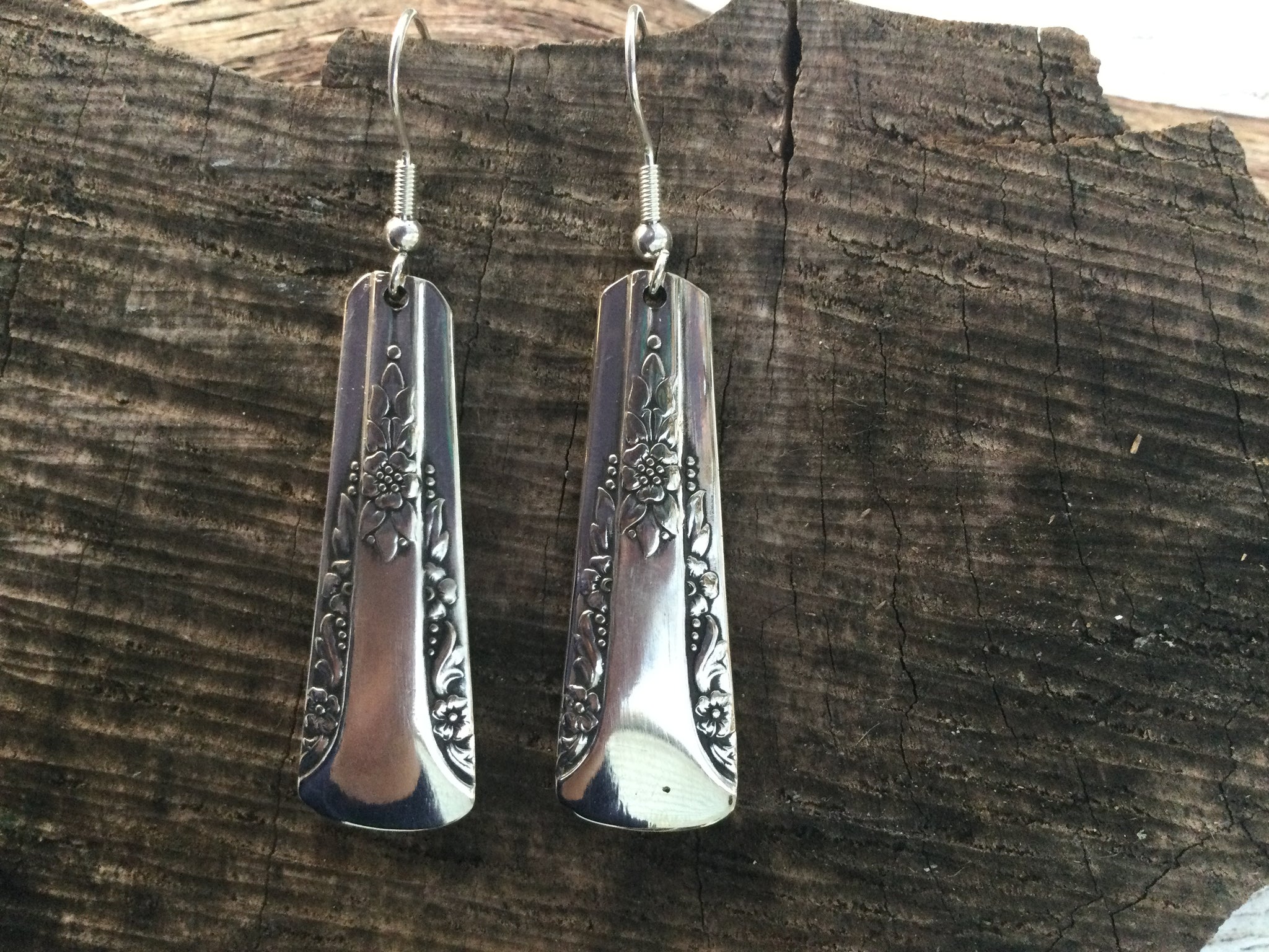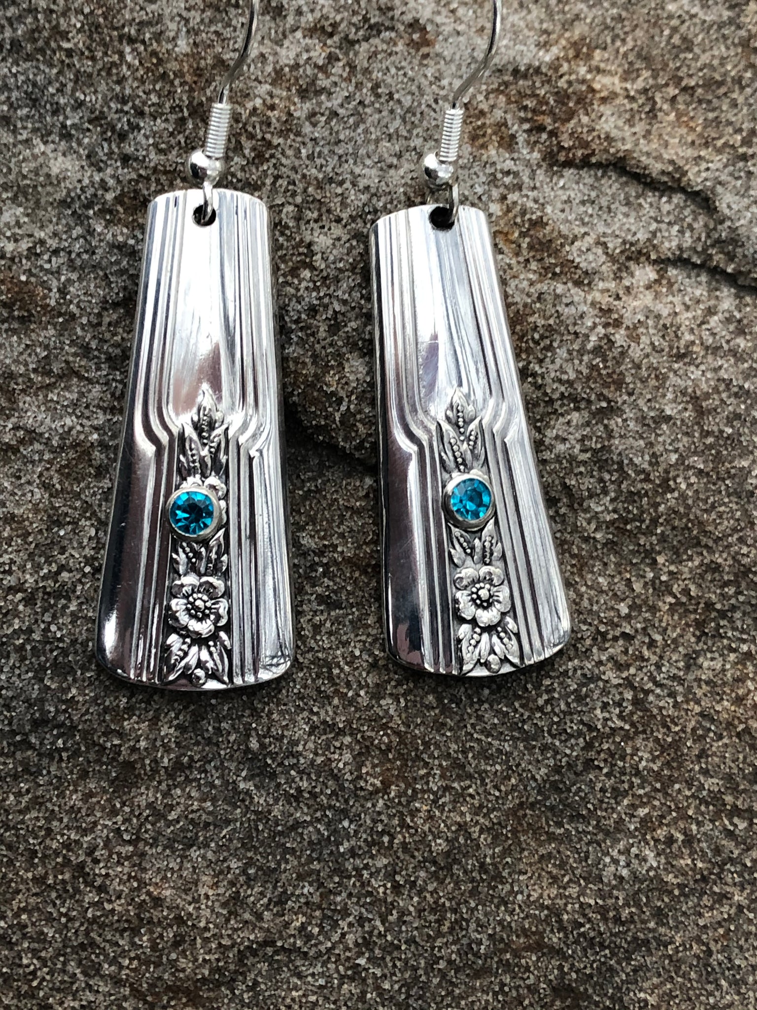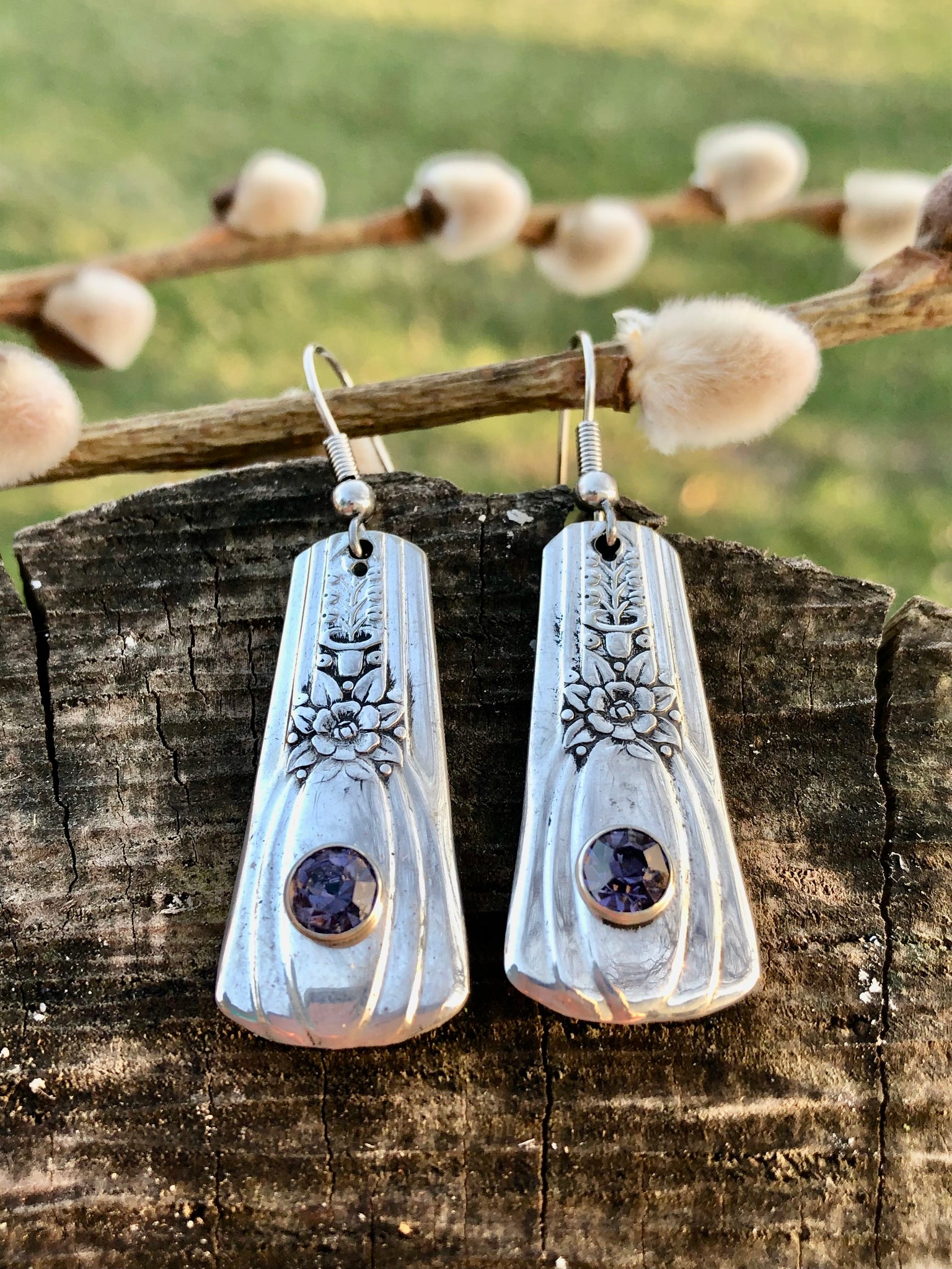 Vintage silverware earrings with or without crystals. All of the earrings are silver plated with surgical steel ear wires. The earrings are sealed with Renaissance Wax to resist tarnishing.