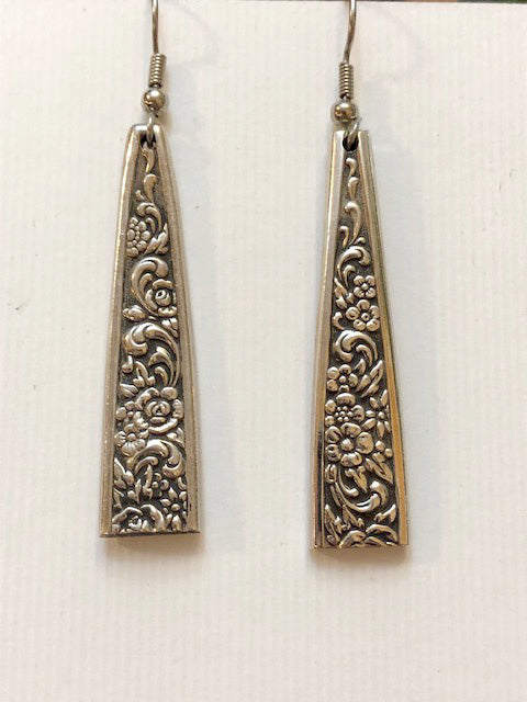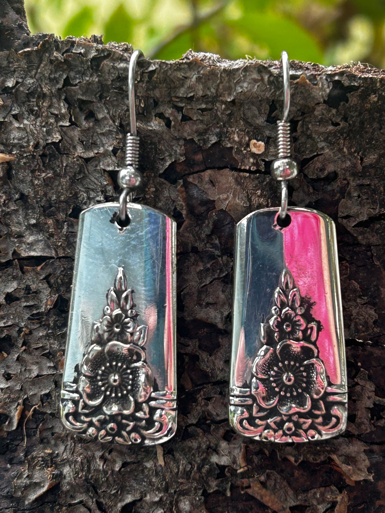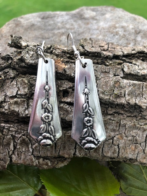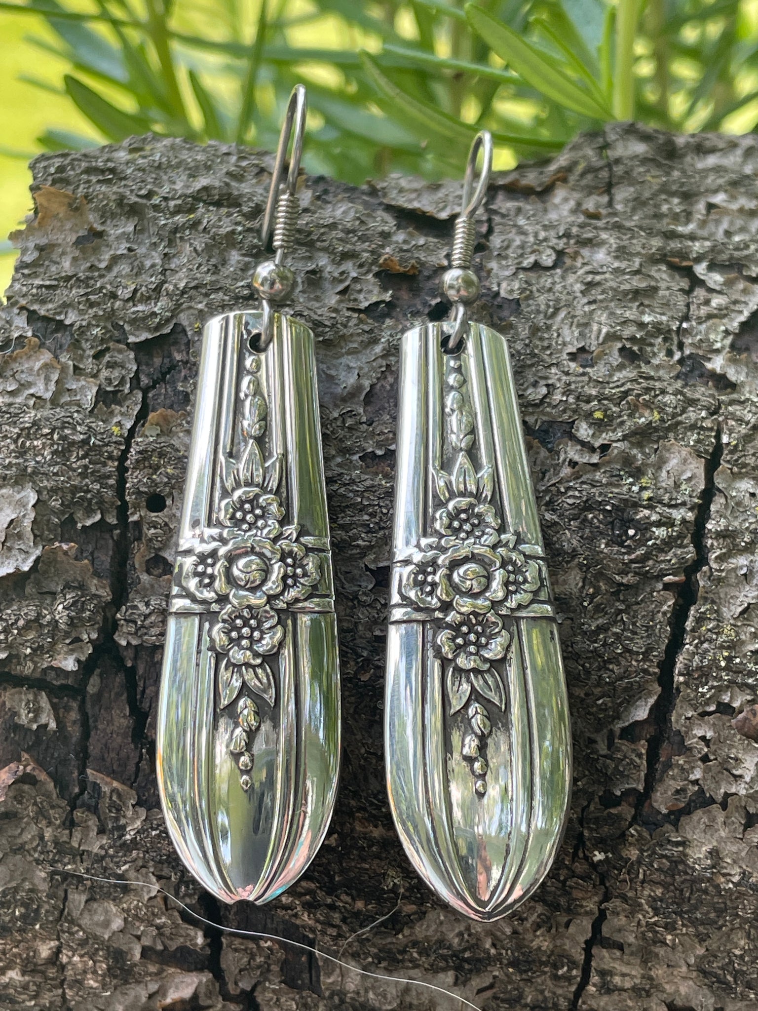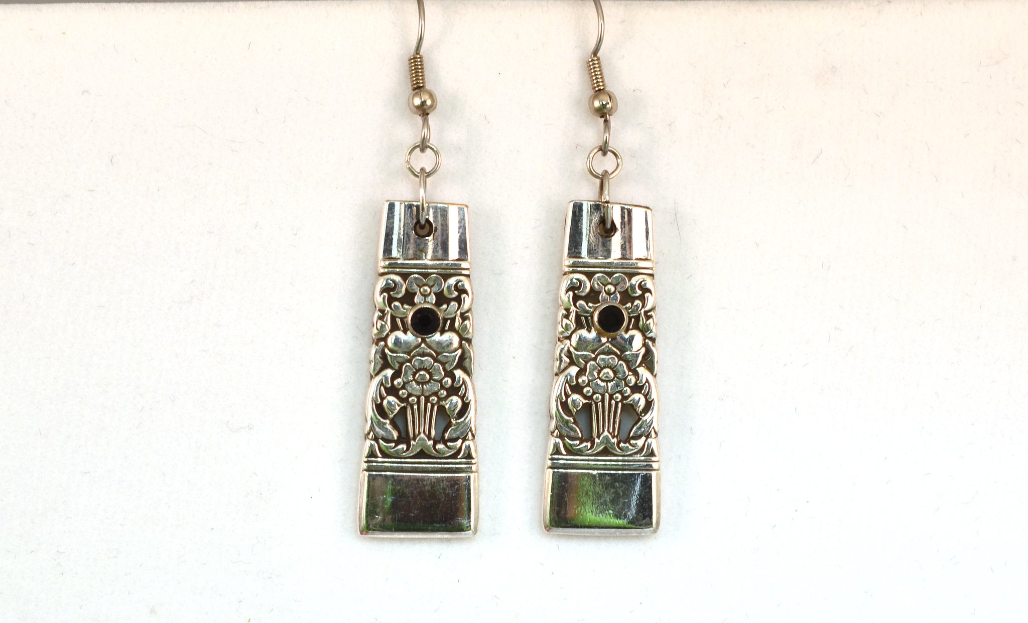 Vintage silverware earrings with or without crystals. All of the earrings are silver plated with surgical steel ear wires. The earrings are sealed with Renaissance Wax to resist tarnishing.