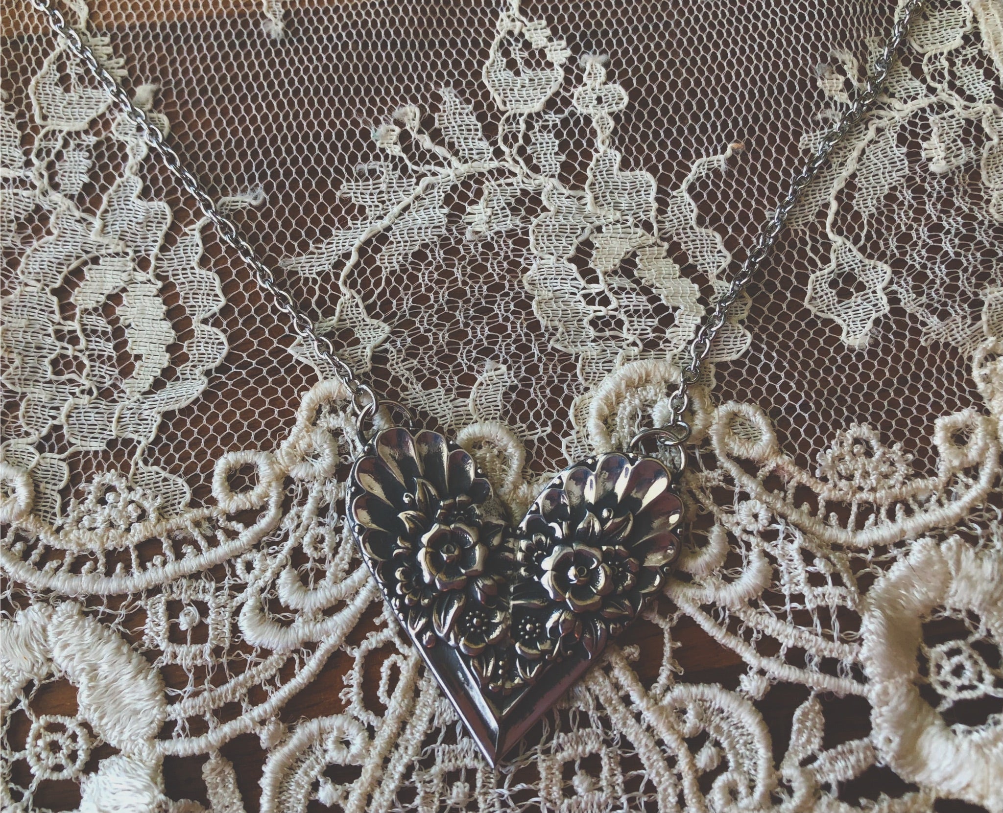 Silver plated Jubilee pattern silverware by International Silver and has been crafted into a delicate heart. The heart measures 1 1/2 inches by 1 1/2 inches with a 22-inch costume chain. Perfect for the one who loves flowers and shares your heart! Other chain lengths can be found under variances.