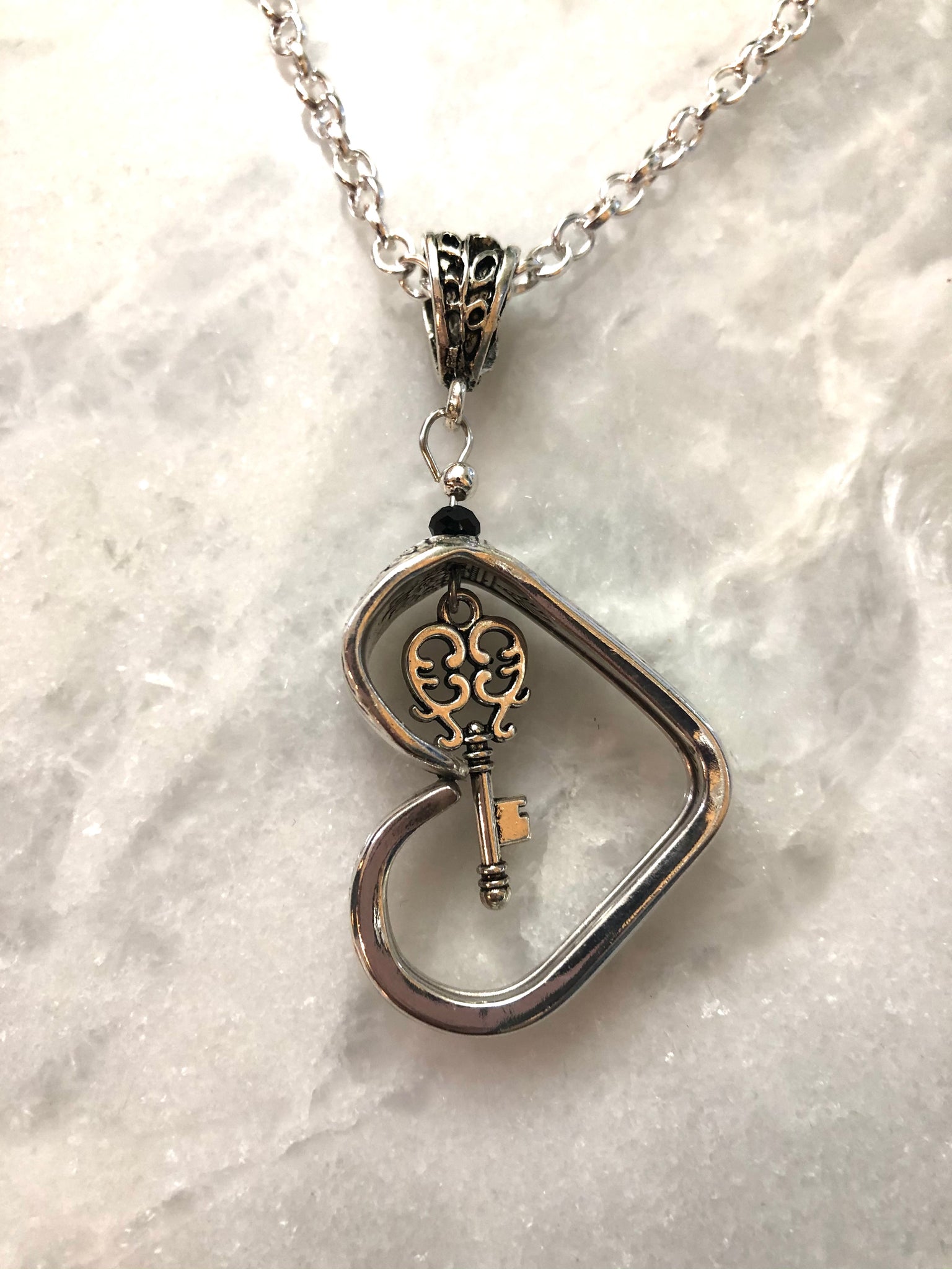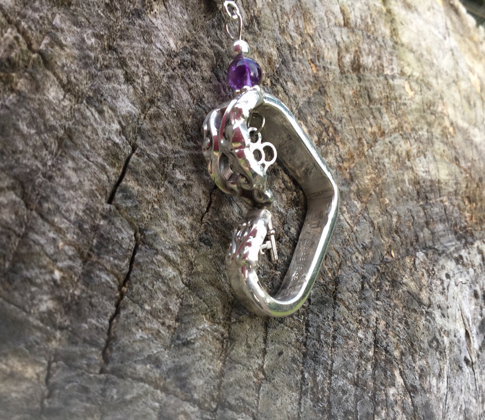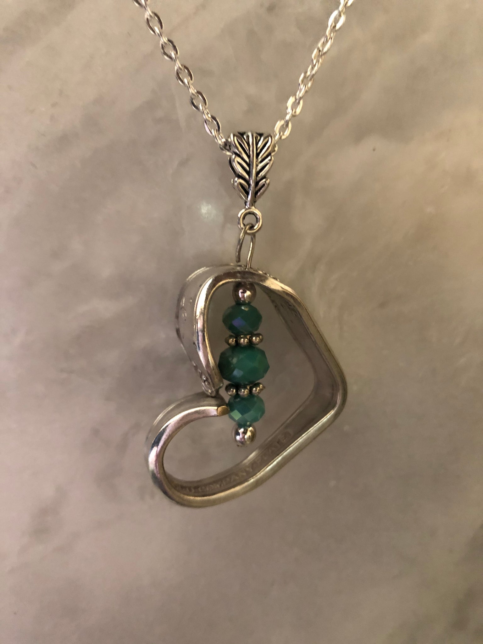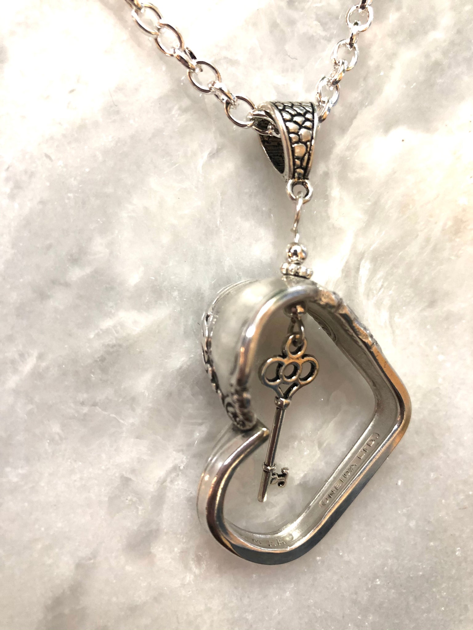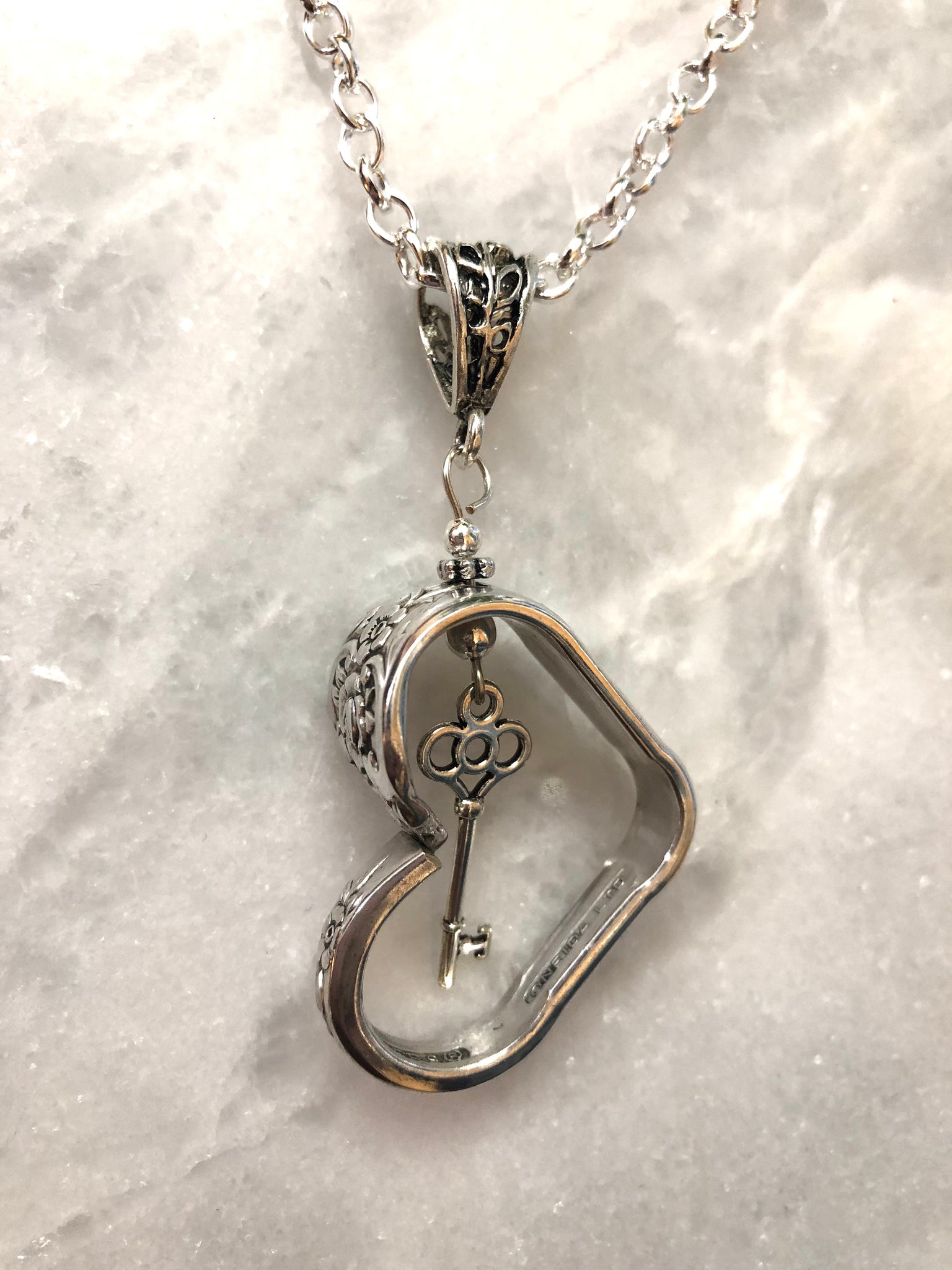 Share the key to your heart with a floating heart. These necklaces are made from vintage silver-plated silverware and measure about 1 1/2 “tall by 1 “wide. The hearts are unique based on the silverware pattern, as well as the interior charm, which could be a key or crystals. Each necklace comes with a 20" costume chain. If you wish a particular pattern, send a message for custom orders.