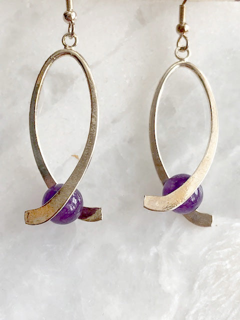 Genuine amethyst beads set in an abstract costume setting are simple and fun earrings! These purple amethyst earrings measure 1 1/2 inches long and 1/2 inch wide with surgical steel war wires.